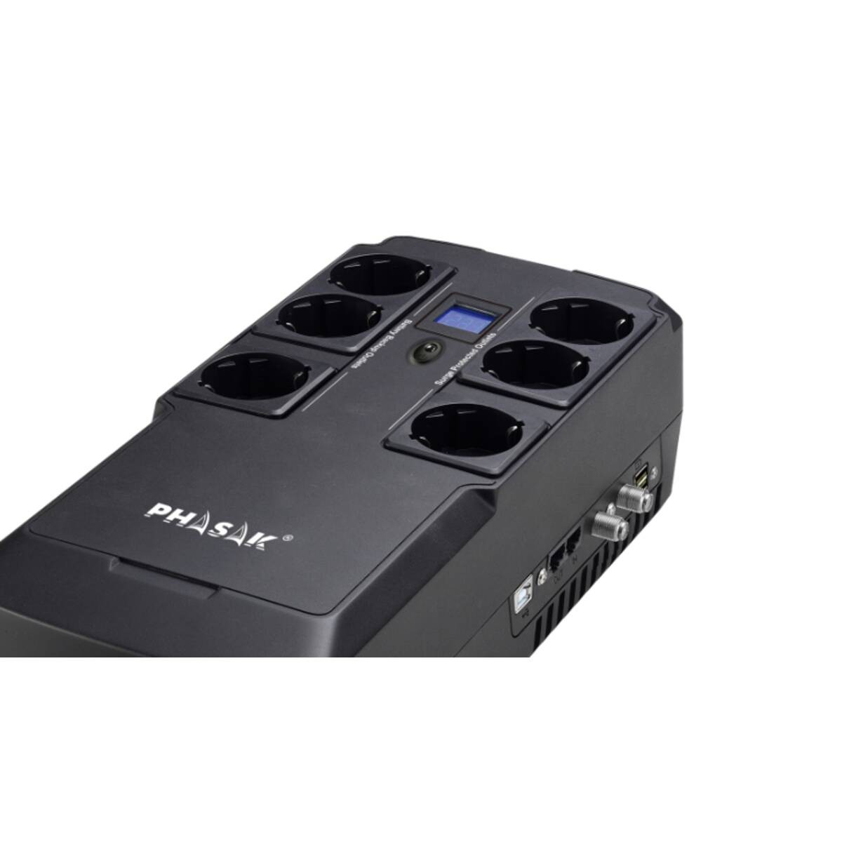 El PH 9478 cuenta con 6 tomas Schuko, de las cuales 3 ofrecen protección adicional contra sobretensiones (Surge Protect). Su tecnología interactiva le permite corregir automáticamente las fluctuaciones de voltaje (altos o bajos) sin consumir la batería, prolongando así la vida útil de la misma. Además, incorpora funcionalidades prácticas como puertos RJ11/RJ45 protegidos contra sobretensiones, protección de cable coaxial, un puerto USB de 5V/2A para cargar dispositivos móviles y un puerto USB HID para monitorizar y gestionar el SAI desde el ordenador mediante el software de gestión ViewPower. Ofrece arranque en frío y reinicio automático tras un corte de energía, garantizando que sus equipos reanuden su funcionamiento de manera segura.
